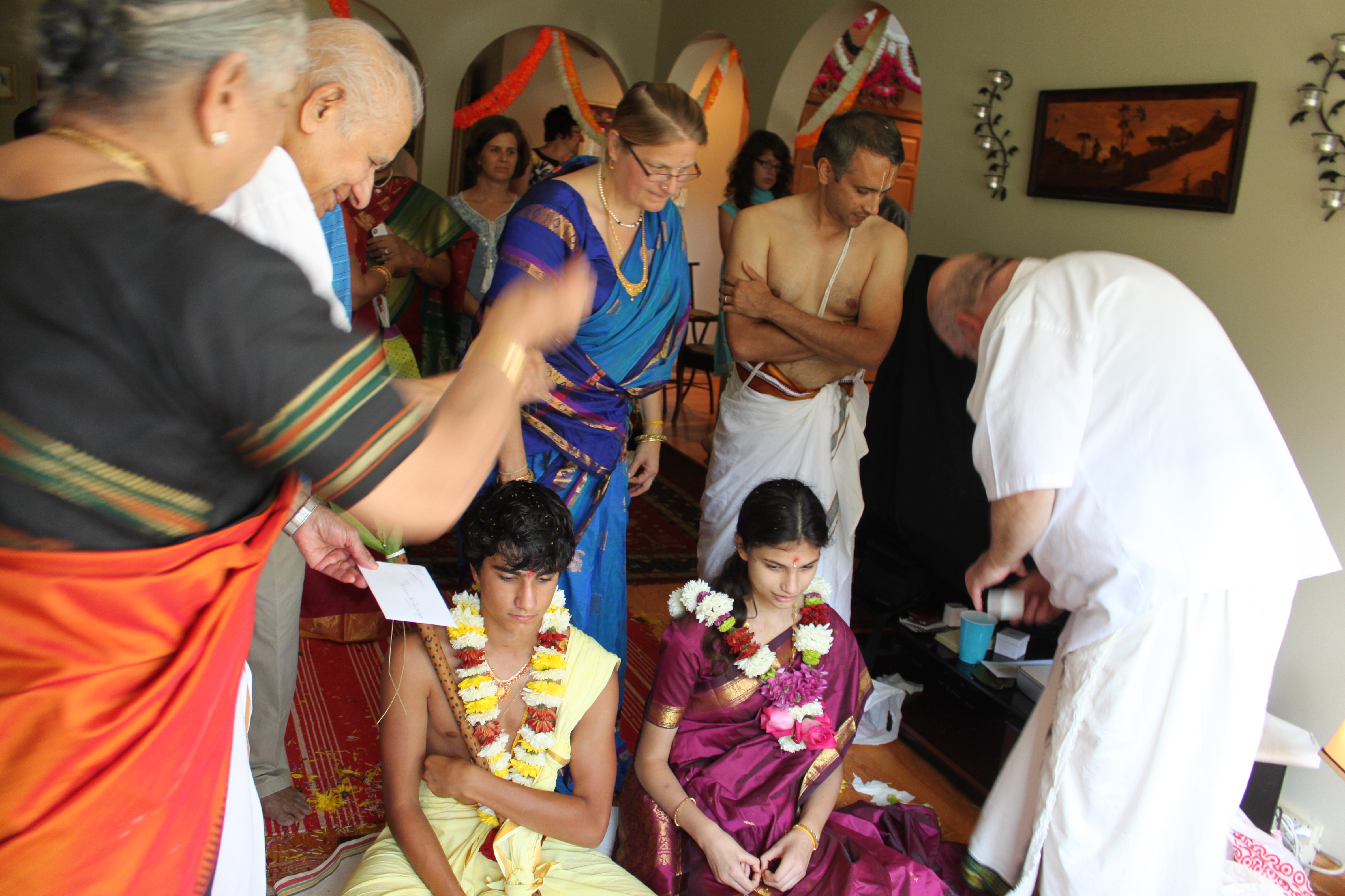 Our two children receiving the blessings of their elders at their Hindu coming of age ceremonies.