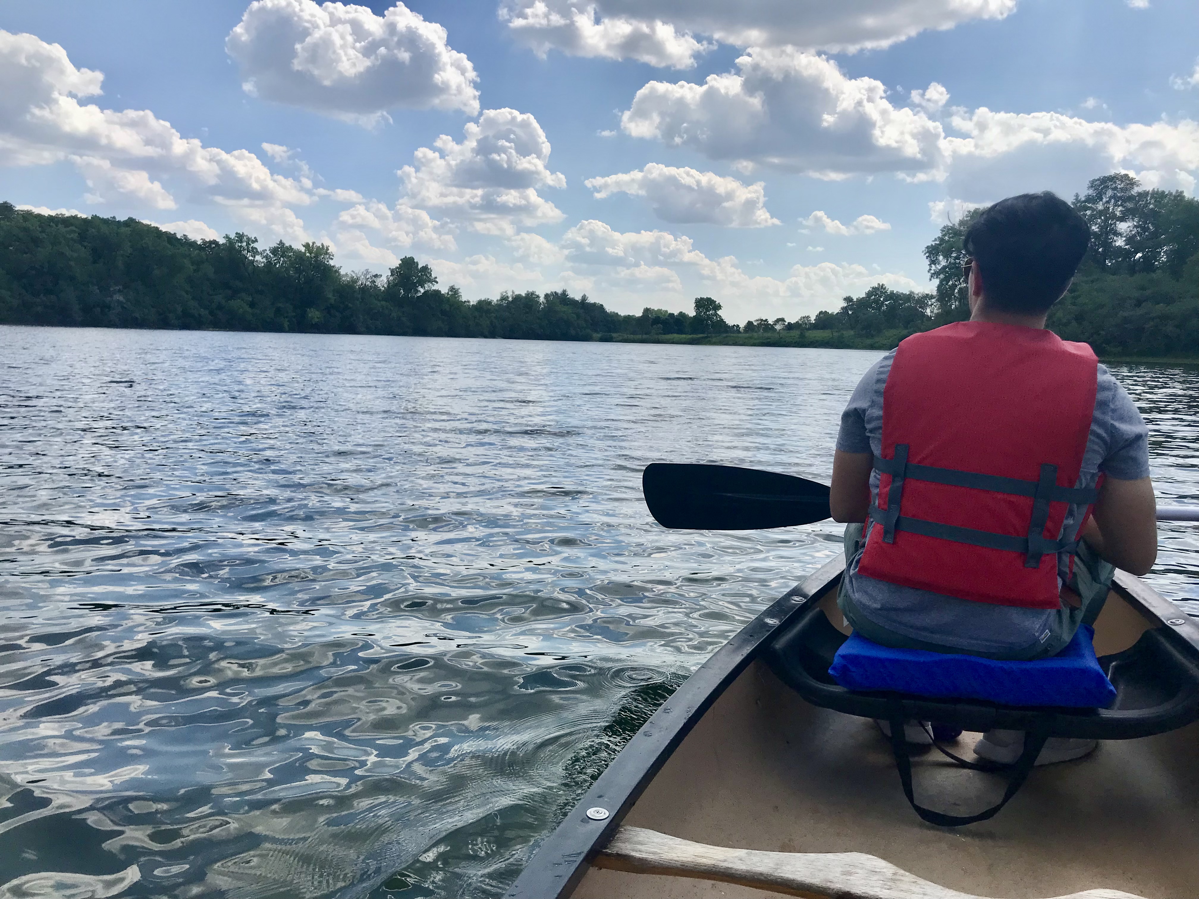 Notice blue skies, white clouds, shimmering water, stillness in the breeze, the sound of water against the oar.