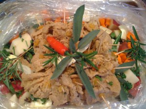 The kids join in the fun by harvesting the fresh herbs from the garden–parsley. sage, rosemary and thyme…(you should be hearing a Simon and Garfunkel tune in your head at this point.)  I place the two roasts next to one another and attach the “dark meat” Seiten by toothpicks to the roasts.  I add a dried cranberry to the end of each toothpick for color and flavor–golden raisins work too.  We place the fresh herbs over the entire roast and put it in the oven about 1 hour before we plan to eat.  The children all dance around the oven window with the light on singing, “The turkey’s in the oven!  The turkey’s in the oven!”  My kids know this is not a real turkey of course, but it connects them to the fun of a “normal” American holiday experience.