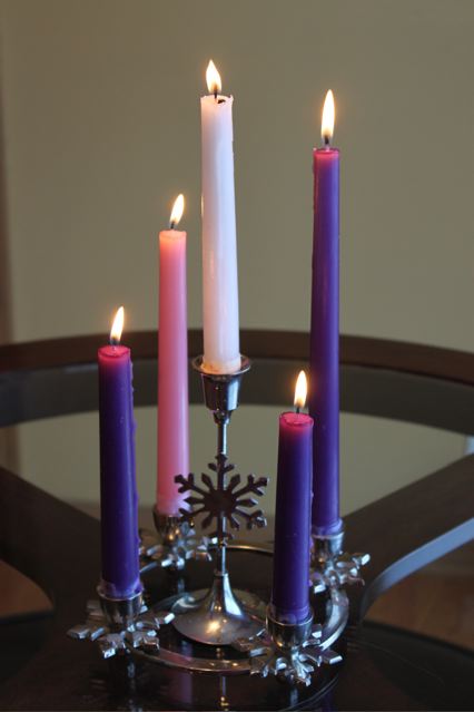 But how can we do that?  In our home, every year we keep an Advent Wreath at our dining table.  The candles represent the four weeks leading up to Christmas–Two purple candles for Hope, and Love.  The pink candle is  Joy, and the final purple candle is Peace.  On Christmas Eve we light the white candle which is the Christ Candle–the light of our world.  These candles are most magical when it is dark outside–before all the lights are turned on.  It is in our darkest nights that the light in our life seems to shine the brightest.