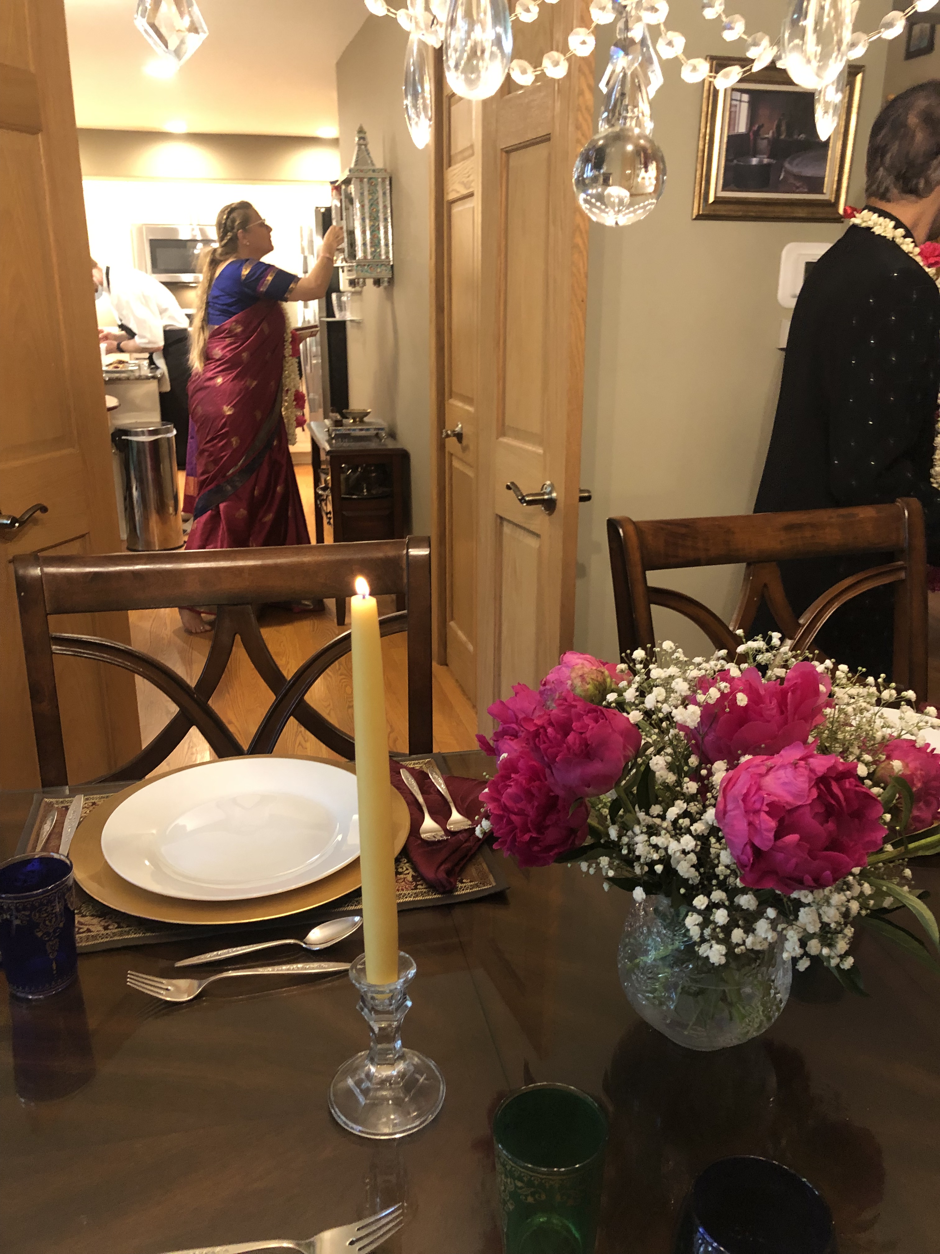 If we could, we would have gone to India and bowed before Amma and Appa and asked for their blessings. But they each have died and their blessings are ours to give to others now. So we decided it was time for us to bless others. In the Hindu marriage ceremony, it is traditional for the bride and groom to wear fragrant garlands and then exchange them. A game is played where the bride or groom tries to evade their partner’s attempt to place the garland around their neck, harkening back to a time when people were married very young. So we instead ordered jasmine garlands for each of our guests from our local Indian flower shop (isn’t it amazing to find one in America?!). We gave each of our dear friends garlands and celebrated the longevity of their marriages and offered our blessings…a blend of the traditional Indian practice while honoring the joy of American friendship!