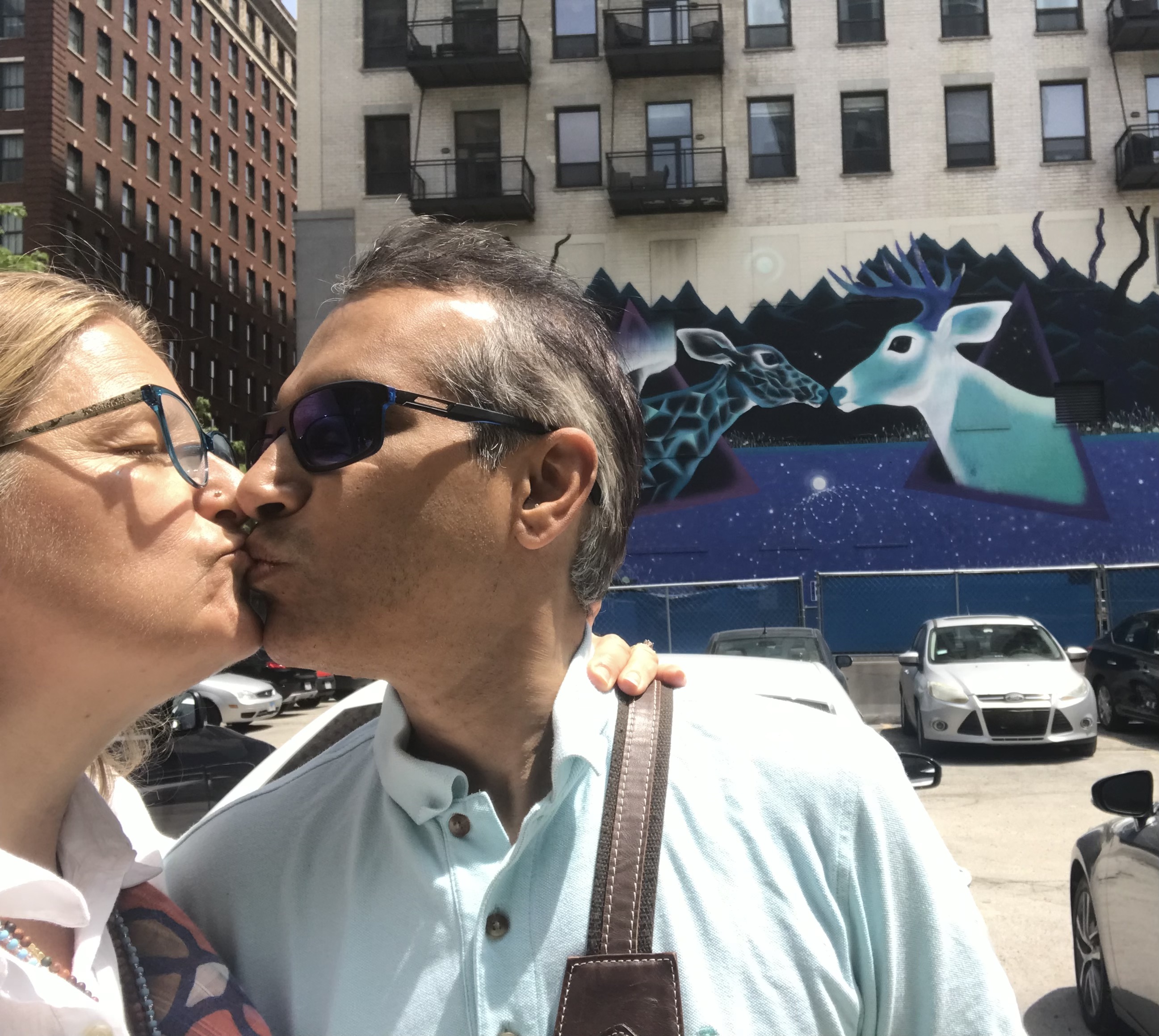 A stolen kiss in the Wabash Arts Corridor in front of a mural depicting two deer nose kissing!
